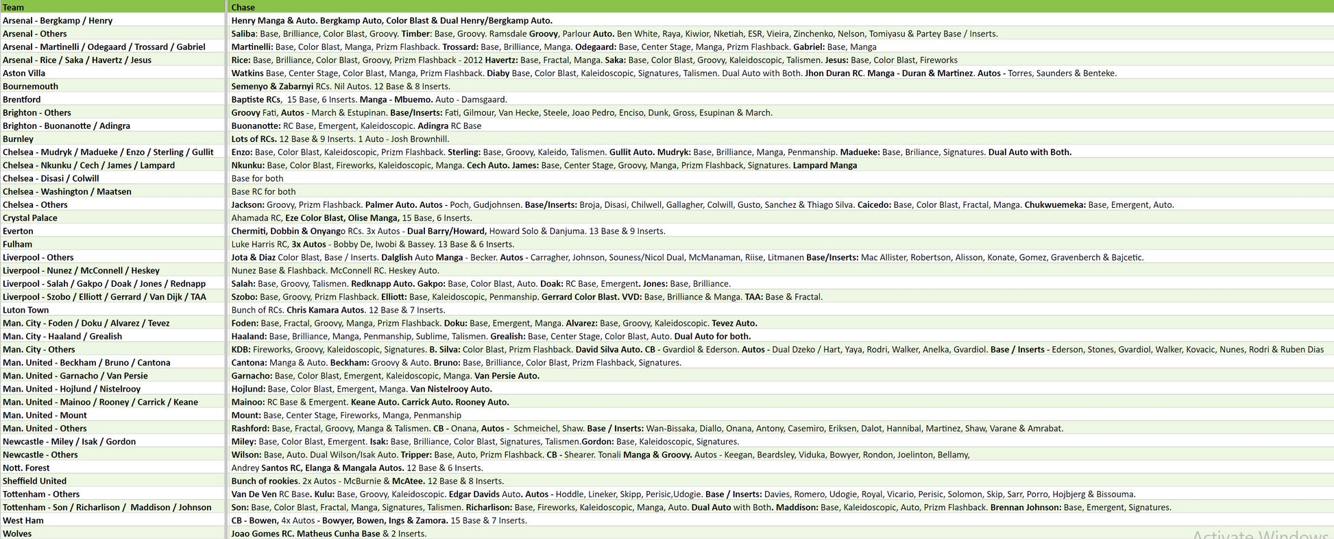 1x 23/24 EPL Prizm First Off The Line (FOTL) ft 1 FOTL Exclusive Auto Blue Shimmer or Black 1/1, 1 Exclusive Blue Shimmer /8 or Black Shimmer 1/1 + 16 Parallels Per Box!
