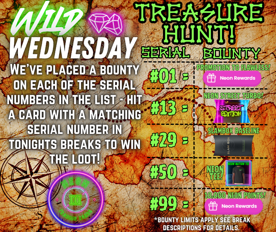 We've placed a bounty on 5 serial numbers. Hit a card with a matching left-hand serial number to win the matching bounty - e.g. a card number 01/49 will win an instant promotion to FLAWLESS level in their Neon Rewards (or 10,000 Neon Points if already Flawless!)