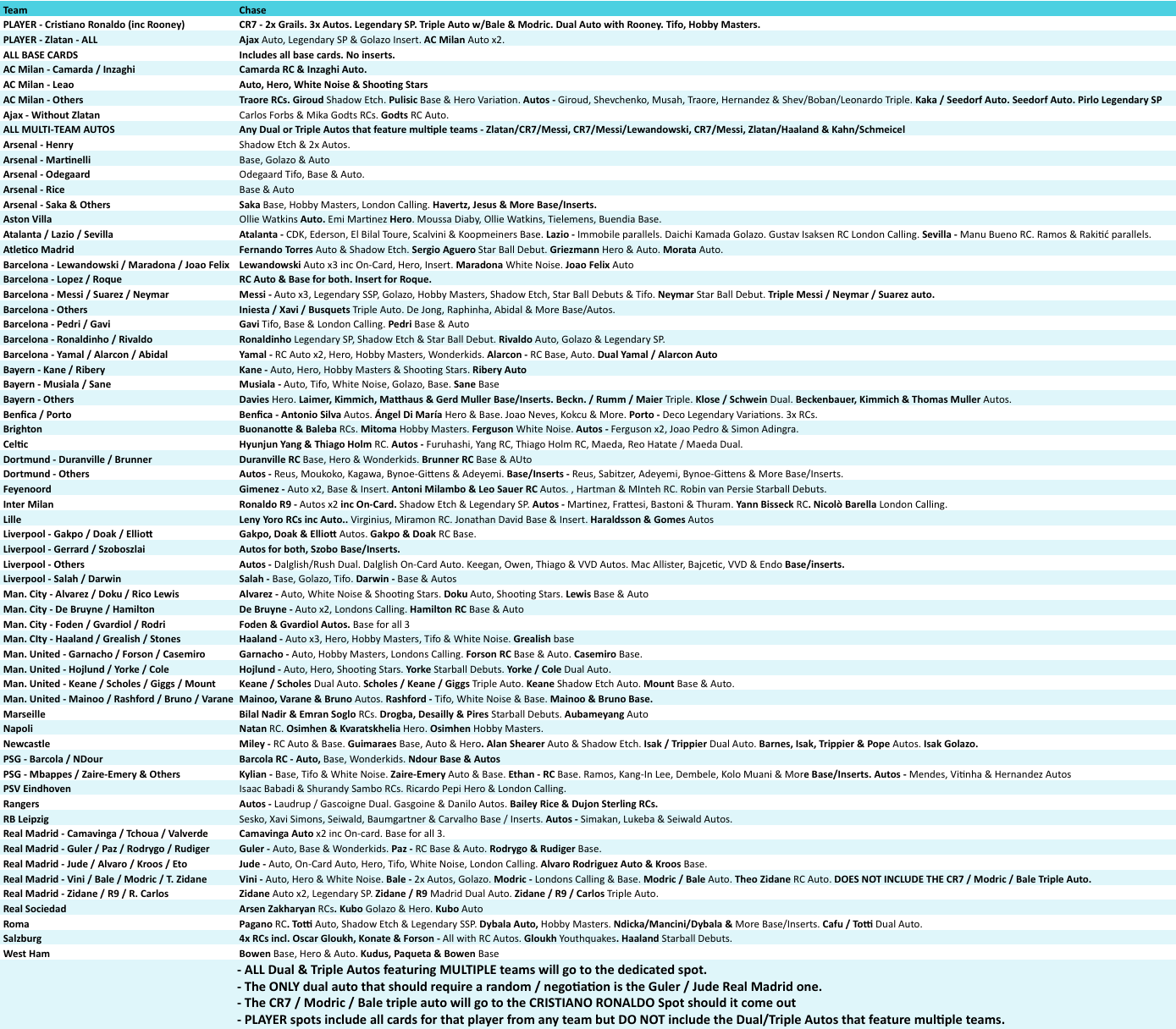- PLAYER spots include all cards for that player from any team but DO NOT include the Dual/Triple Autos that feature multiple teams.