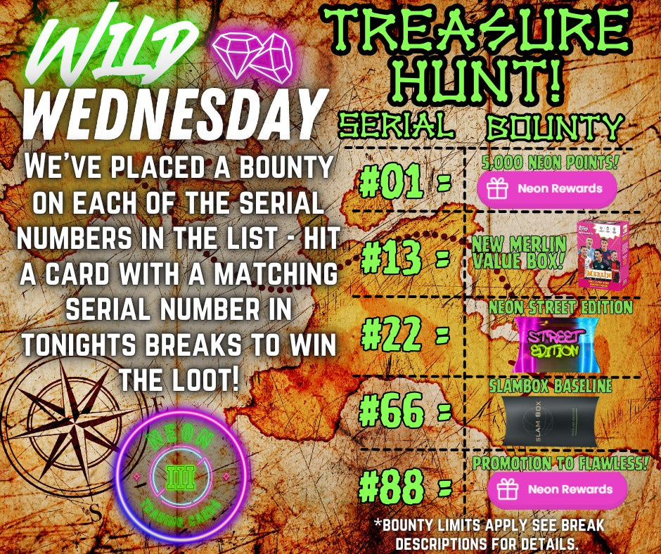 We've placed a bounty on 5 serial numbers. Hit a card with a matching left-hand serial number to win the matching bounty - e.g. a card number 88/99 will win an instant promotion to FLAWLESS level in their Neon Rewards (or 5,000 Neon Points if already Flawless!)