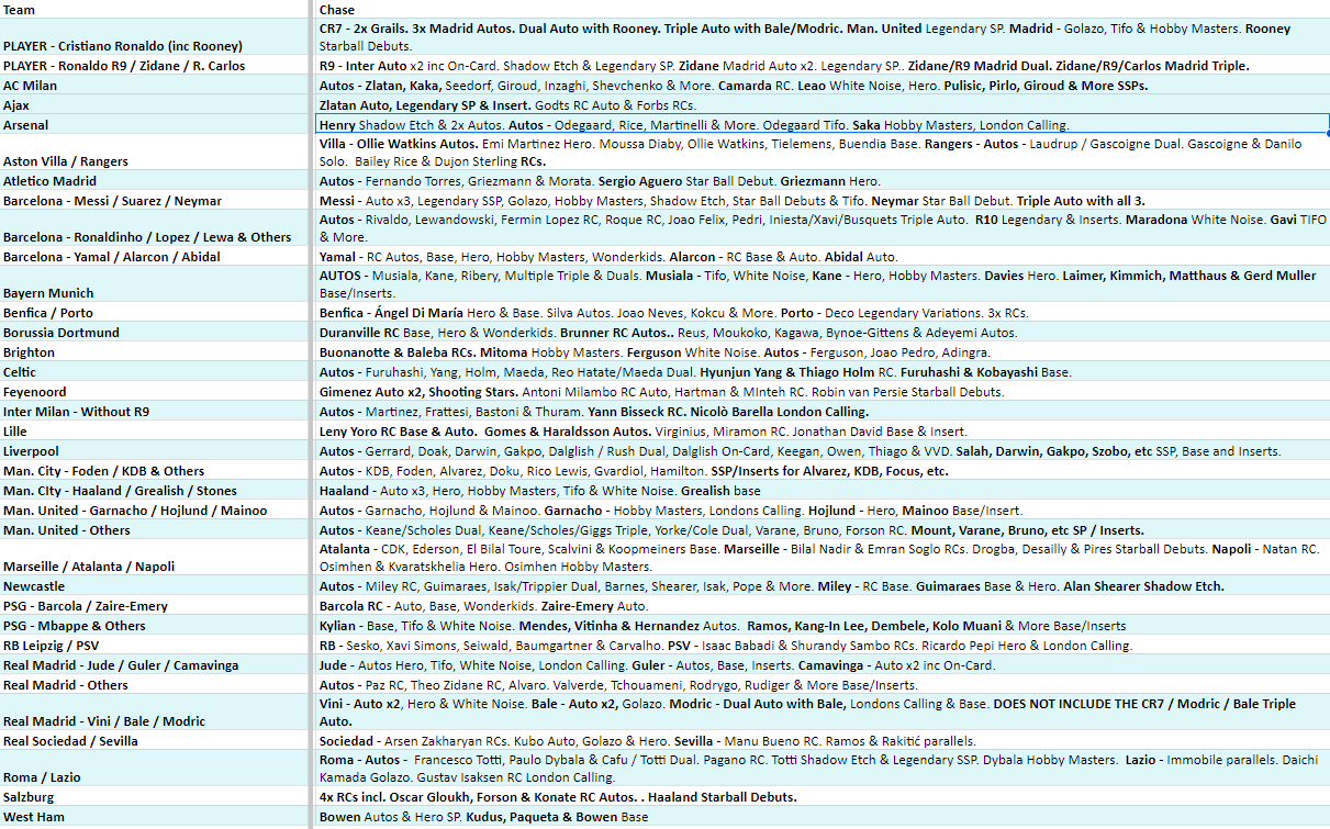 - PLAYER spots include all cards for that player from any team but DO NOT include the Dual/Triple Autos that feature multiple teams.