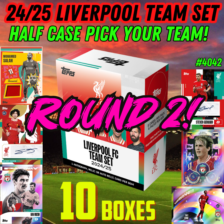 Half Case - 10 Boxes - 24/25 Liverpool Team Set ft 1 Autograph, Patch Auto or Patch per box and chasing SSP & Numbered variations of Liverpool stars both past and present!